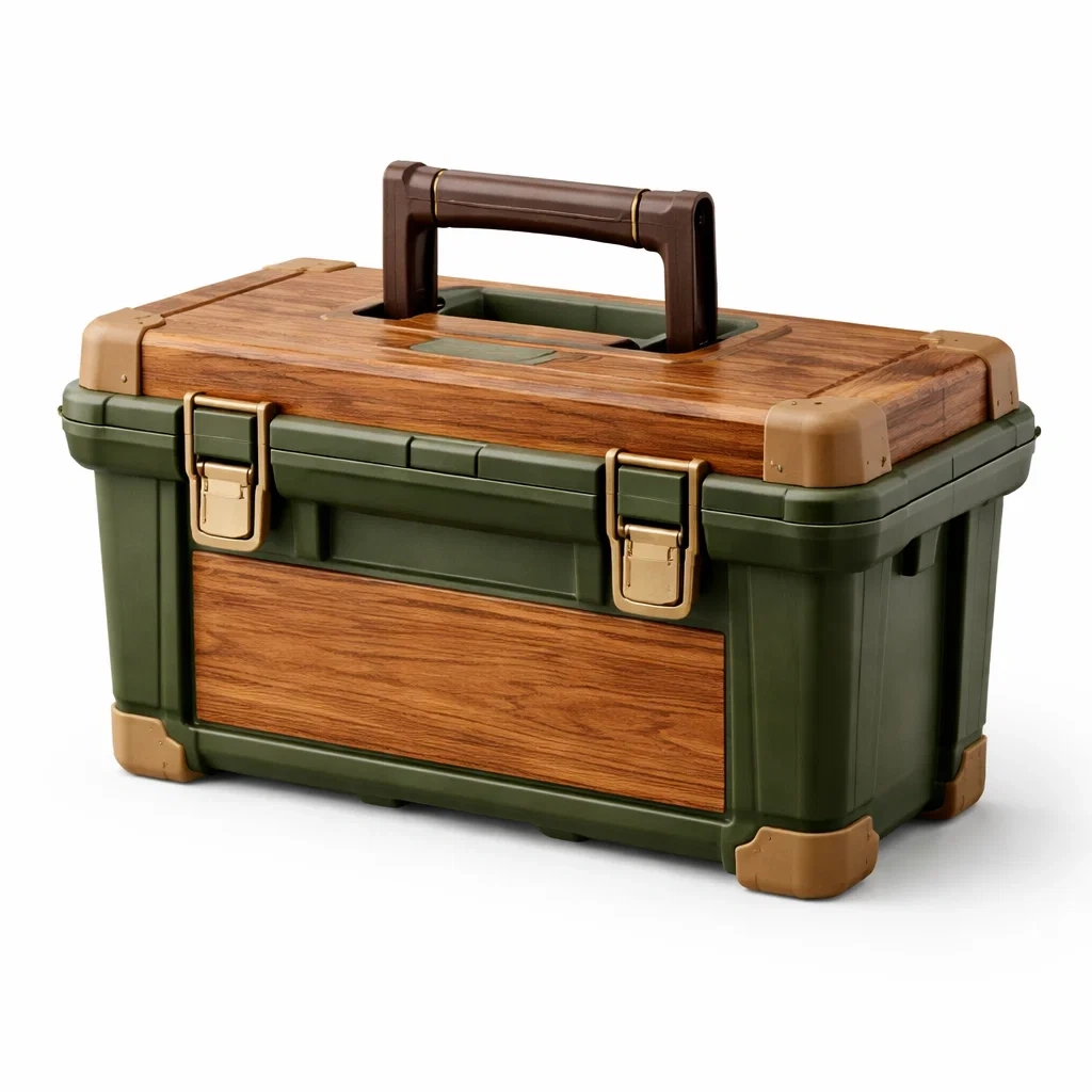 Externe Materialien: Robuster ABS-Kunststoff in Holzoptik, Stahlverschlüsse
