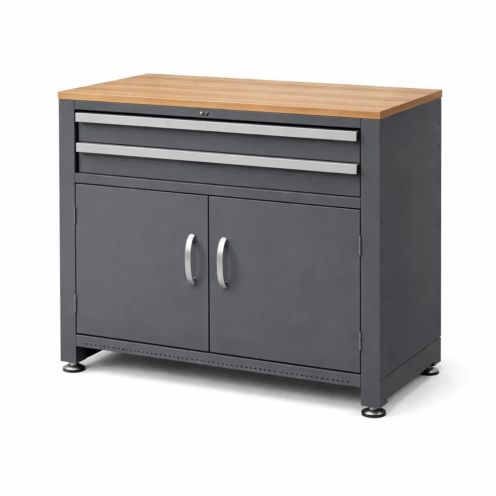 Der Schrank besteht aus robustem Stahl mit einer Oberfläche aus Massivholz. Er verfügt über zwei Schubladen und zwei Türen zur Aufbewahrung. Die Gesamtmaße betragen 90 cm in der Länge, 45 cm in der Breite und 92 cm in der Höhe. Die Holzoberfläche hat eine graue Optik.
